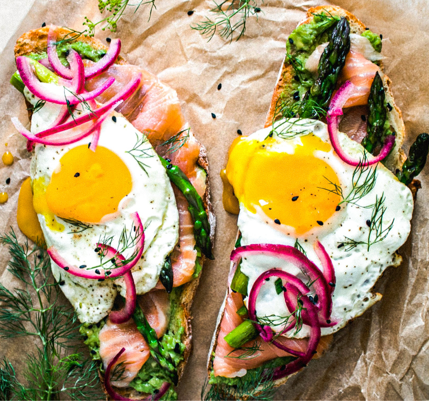 The creamy avocado goes perfectly with the tangy and slightly sweet pickled red onions. Avocados are a source of healthy fats (reference), and onions are packed with antioxidants to help your immune system (reference). This is a very satisfying vegetarian breakfast that works as a balanced meal any time of day.