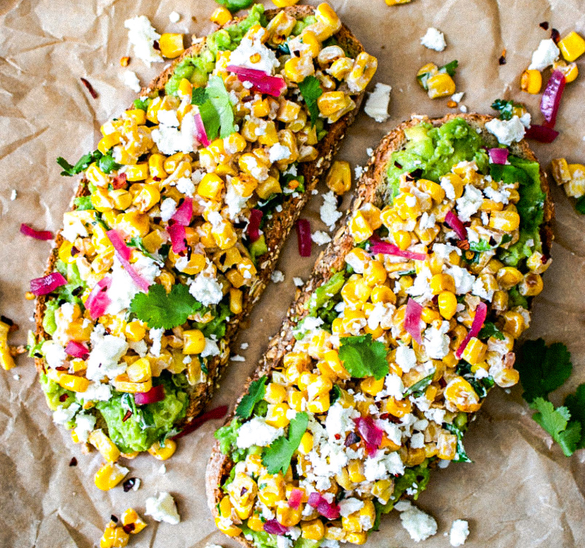 The savory toast inspired by classic elote-style street food with creamy avocado and crispy corn topping is perfect for a quick, fancy weekend Mexican brunch idea. Avocado is a high-quality source of healthy fats and nutrients(reference), creating a healthy vegetarian breakfast option that is flavorful and satisfying.