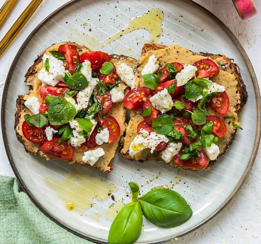 This hummus and mozzarella toast is basically a fresh, healthy pizza on a piece of bread. Topped with juicy tomatoes, fresh mozzarella, and fresh herbs, you get those classic Italian flavors in a balanced meal. Hummus provides plant-based protein (reference) and the fresh tomatoes are a good source of Vitamin C (reference). This is one of the best savory toast topping ideas for a quick lunch or a post-workout snack.
